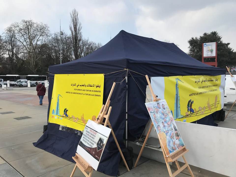 نظمت منظمات حقوقية دولية فعالية " خيمة التعذيب وسجناء الرأي" في العاصمة السويسرية جنيف. وتضمنت الخيمة الإعلامية الحقوقية صورا ومعلومات عن عشرات من معتقلي الرأي في الإمارات.