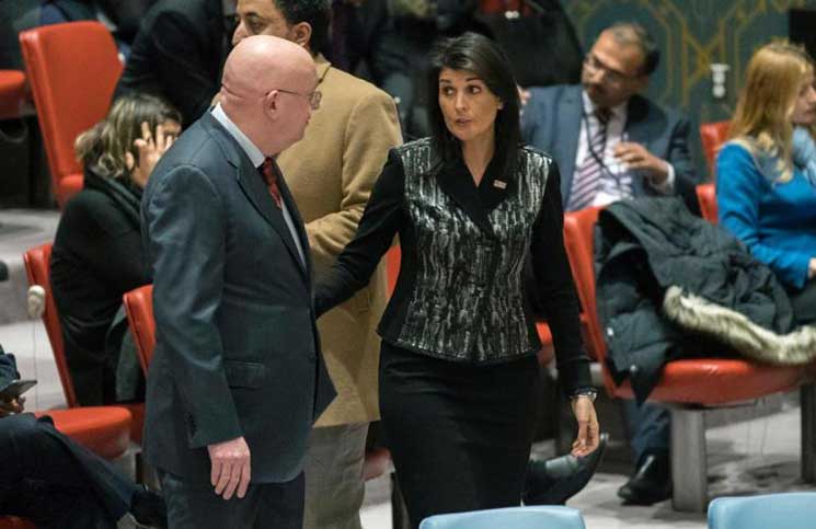 اتهمت السفيرة الأمريكية لدى الأمم المتحدة، نيكي هايلي، روسيا بـ”حماية النظام الإيراني الراعي للإرهاب”، ملوحة باتخاذ بلادها وحلفائها إجراءات ضد طهران “لا تستطيع موسكو منعها”.