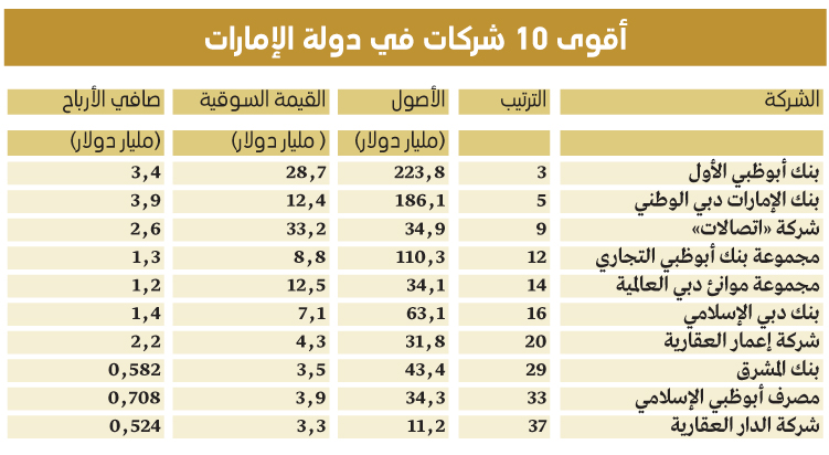 ولفت التصنيف إلى دخول «شركة أرامكو السعودية»، وتصدرها قائمة أقوى 100 شركة في الشرق الأوسط، بقيمة سوقية تبلغ 1.6 تريليون دولار، فيما سجل بنك أبوظبي الأول المرتبة الثالثة بقيمة سوقية تبلغ 28.7 مليار دولار.